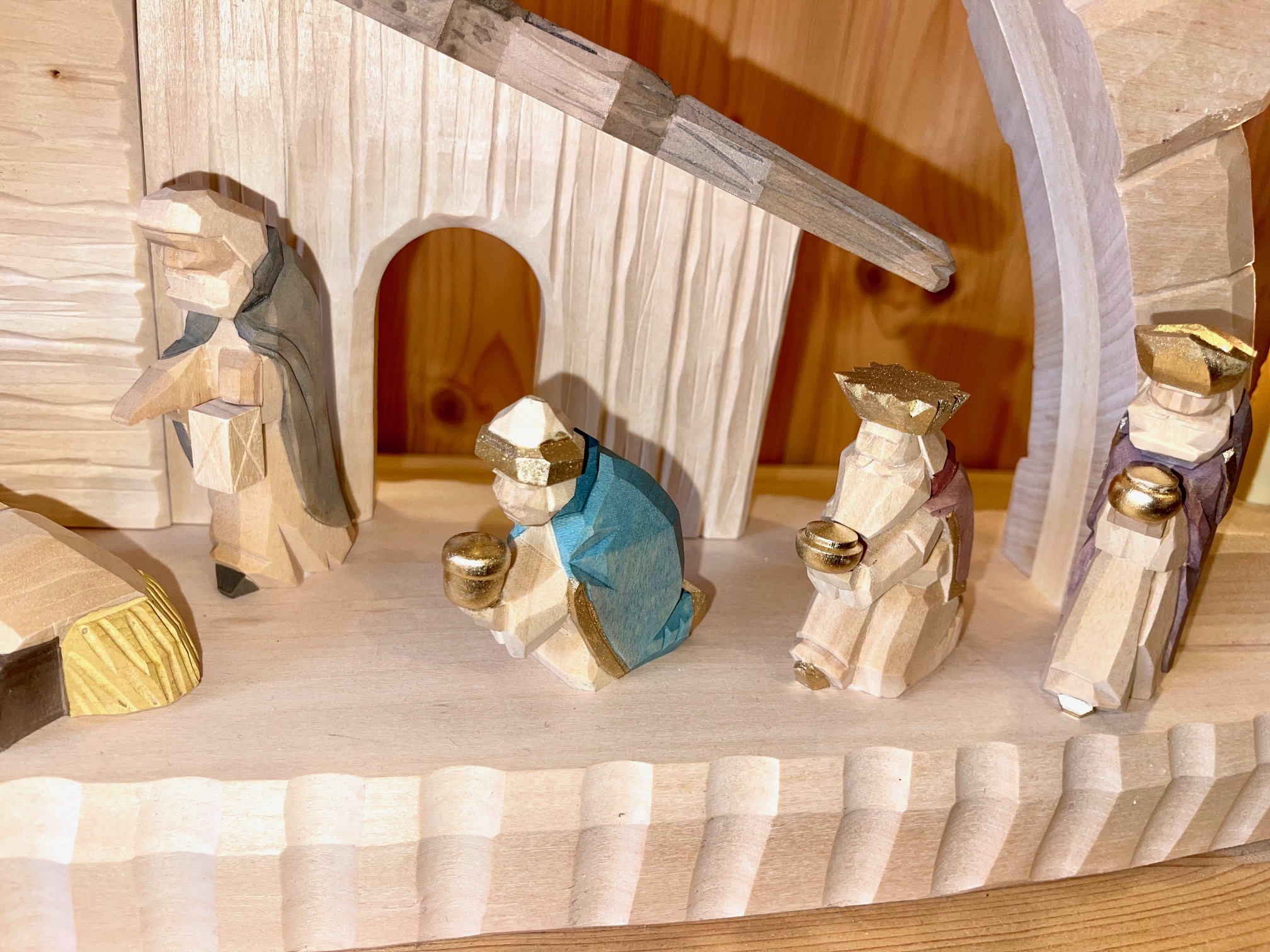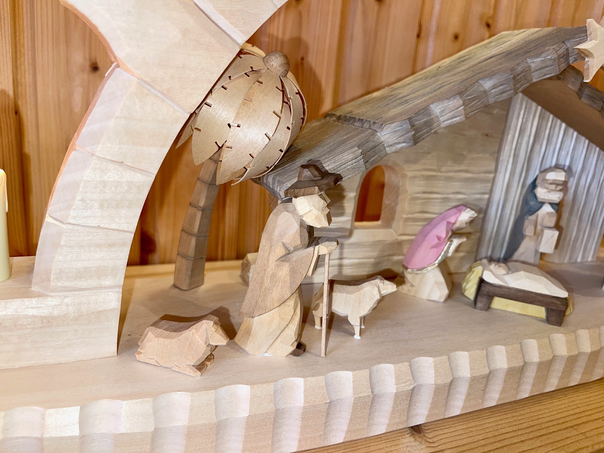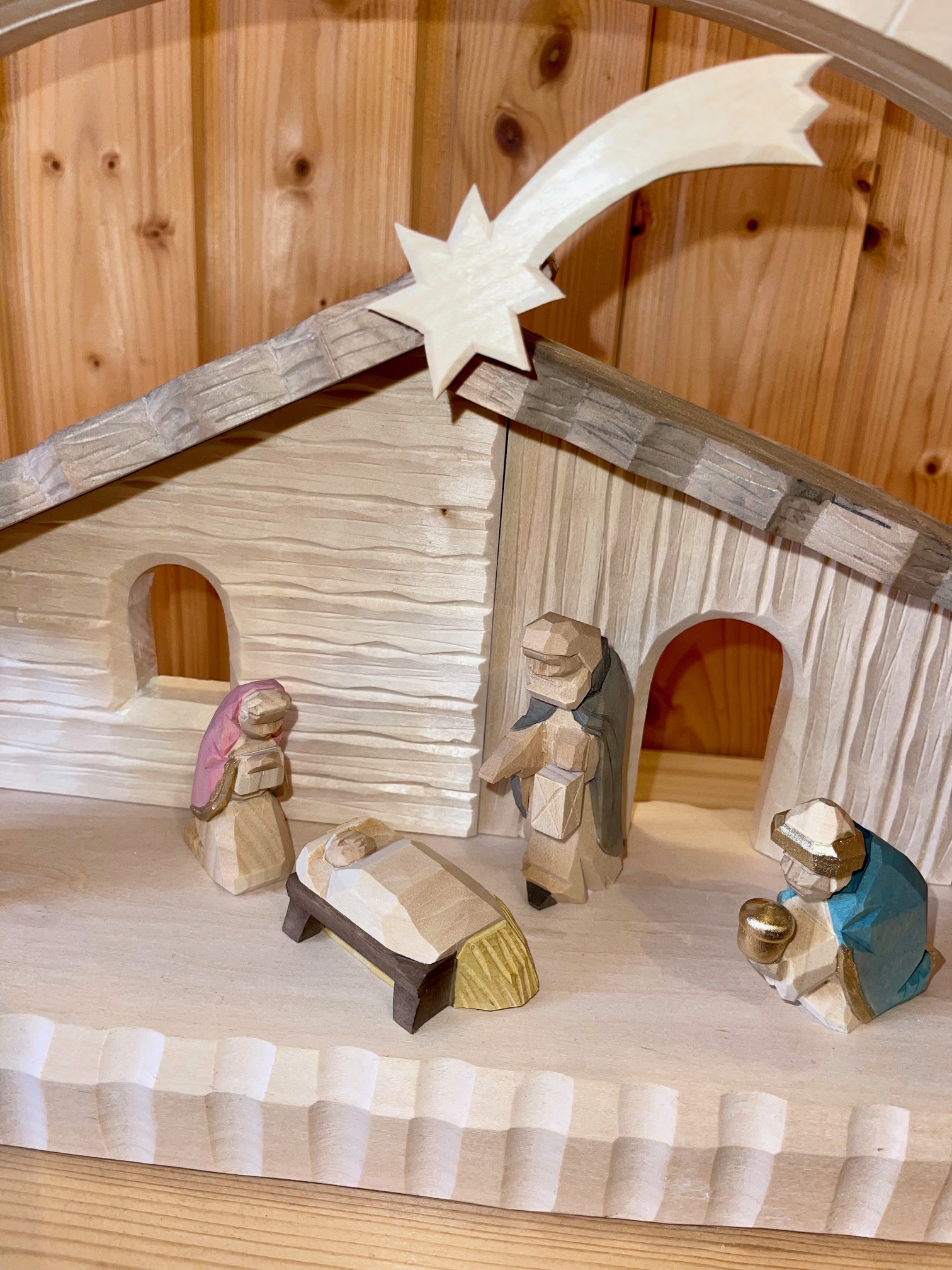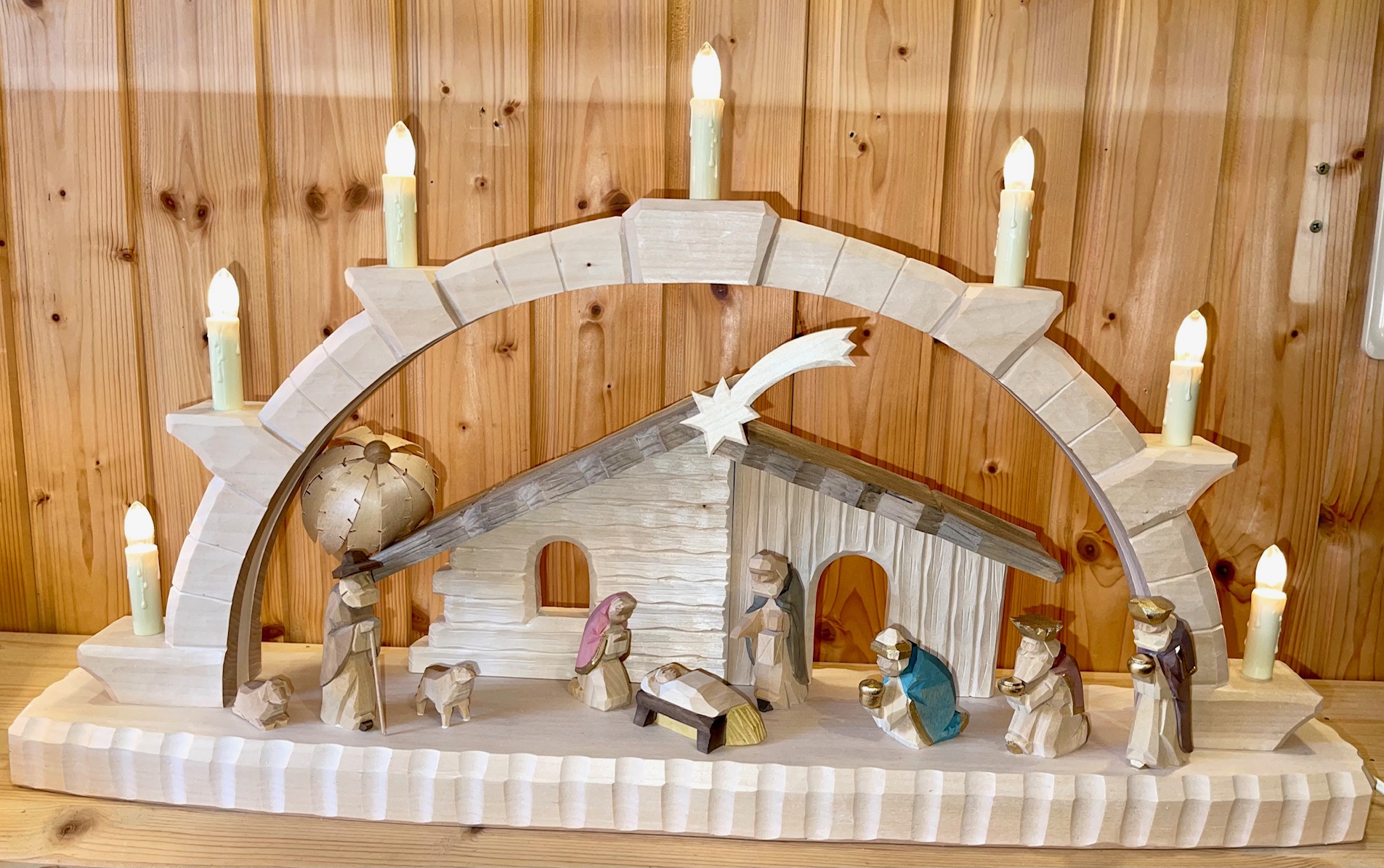 Bogen geschnitzt mit Krippenhaus NEU - farbig
